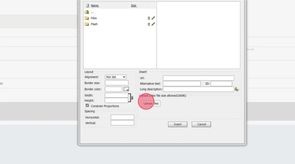 A secondary window will pop up, using the Upload Files button, please select the image to be included in the description.